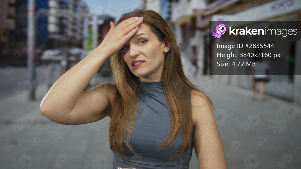 Woman wearing sleeveless top holding hand on forehead while grimacing on sunny city street; stress headache fatigue strain.