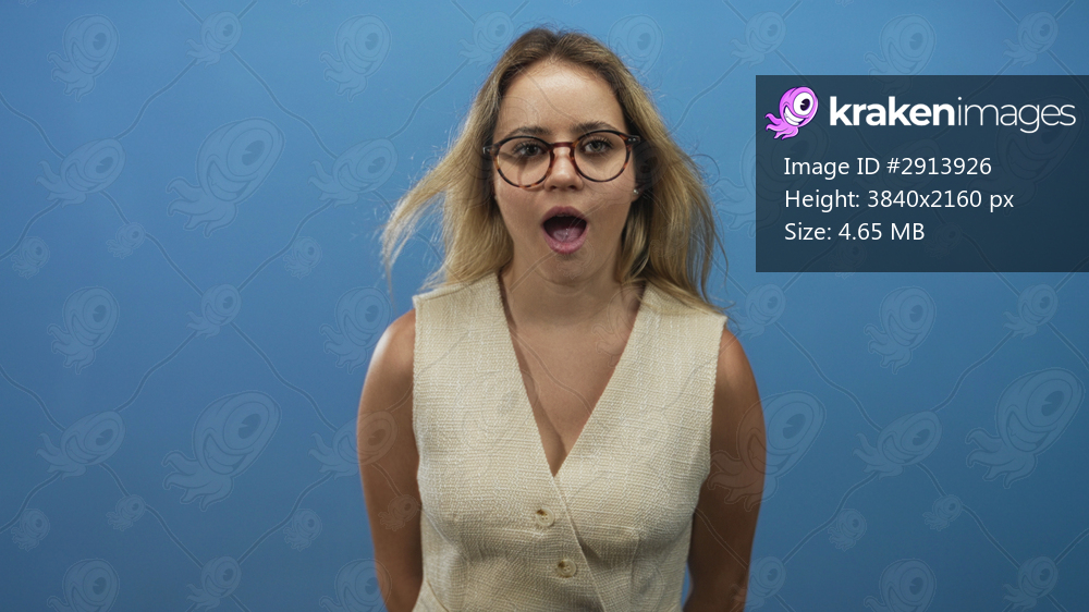 Woman wearing sleeveless vest and glasses, palms up and mouth open in studio against a blue wall; surprise.