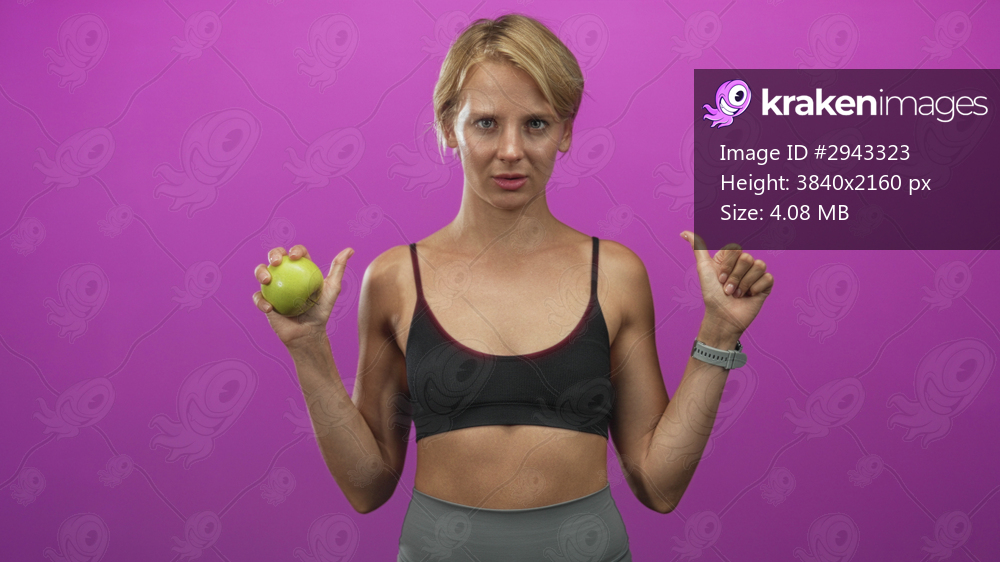 Woman wearing sports bra holds a green apple in left hand and gives thumbs up with right thumb in studio; healthy choice confidence.