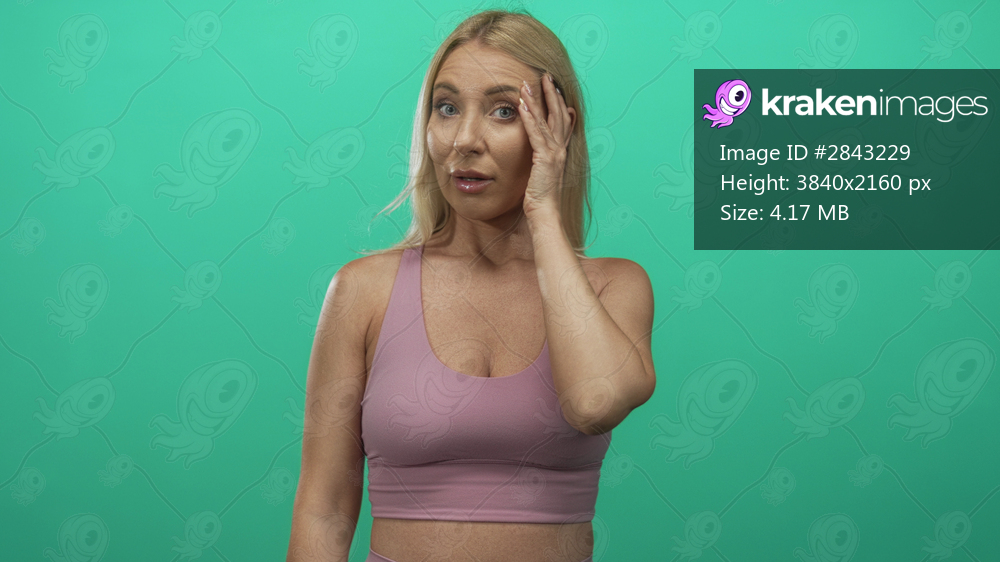 Woman wearing sports bra touches cheek with hand in studio against green wall; toothache discomfort.