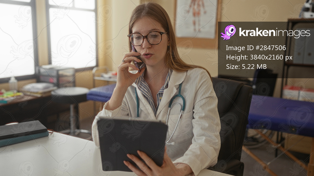 Woman wearing stethoscope holding phone to ear and tablet in medical clinic building; calm concentration.