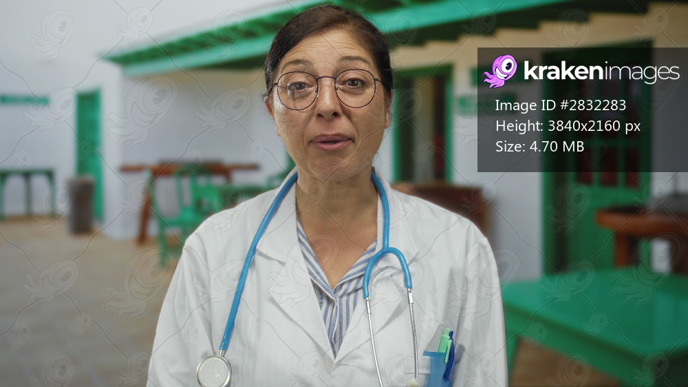 Woman wearing stethoscope and white coat at building entrance holds calm gaze and steady stance; compassion.