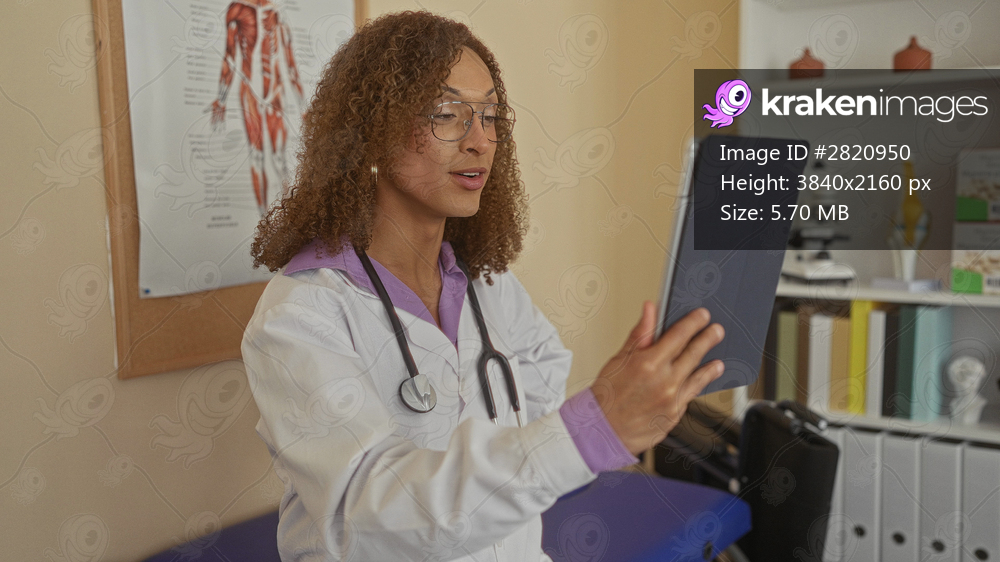 Woman wearing stethoscope and white coat holding tablet during video call in clinic building; remote medical care compassion.