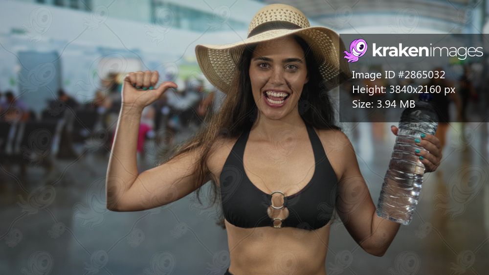 Woman wearing straw hat and bikini holding a water bottle and pointing finger to bottle at airport terminal; vitality.
