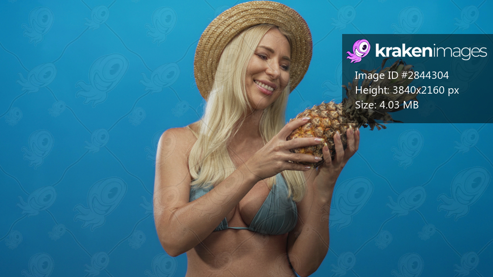 Woman wearing straw hat and bikini top smiling holds fresh pineapple in a blue studio; tropical happiness.