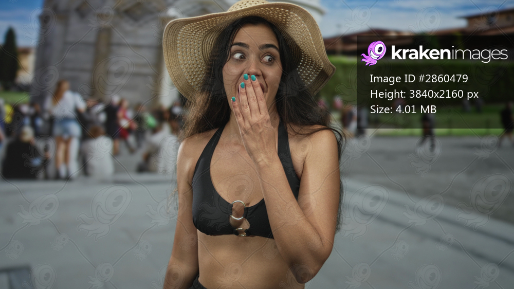 Woman wearing straw hat and black bikini top covering her mouth with finger to lips for silence at pisa tower building; surprise.