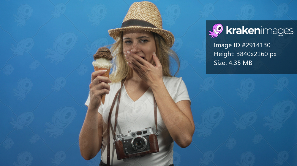 Woman wearing straw hat and camera around neck holding ice cream cone and covering mouth with hand in blue studio; amusement travel vacation.