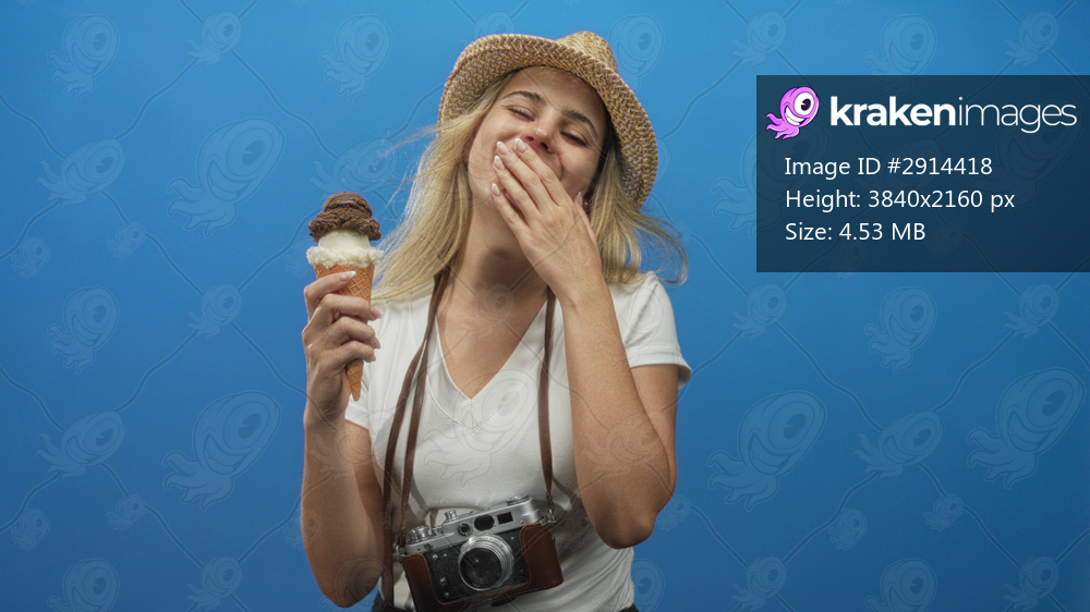 Woman wearing straw hat and camera around neck holding ice cream cone and covering mouth with hand in blue studio; amusement travel vacation.