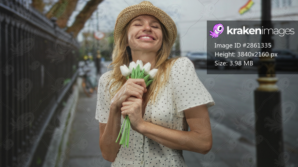 Woman wearing straw hat holds white tulips to chest on street with eyes closed and smiling while hugging bouquet; serenity spring memory.