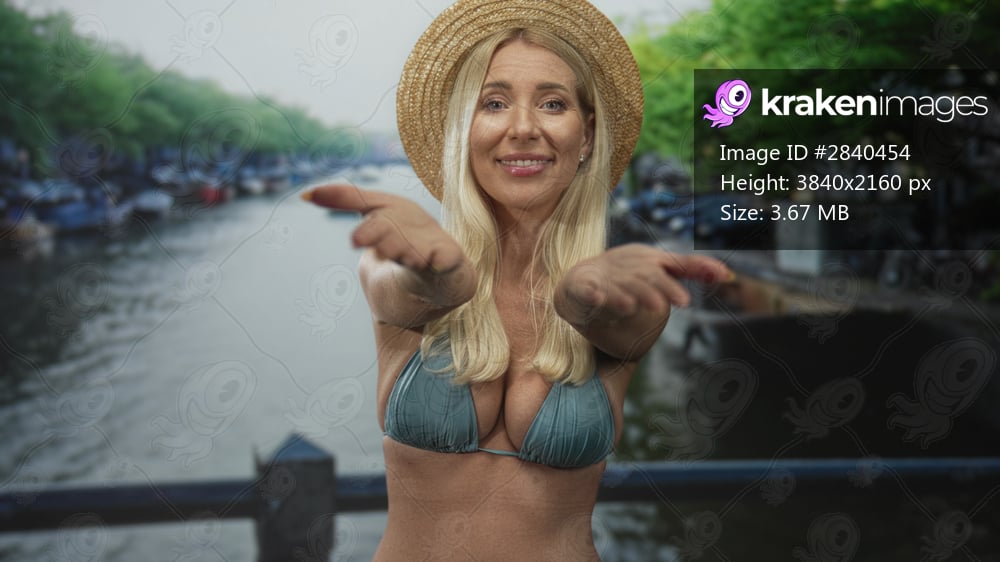 Woman wearing straw hat and teal bikini extends arms by canal on a city street with moored boats behind her; serenity.