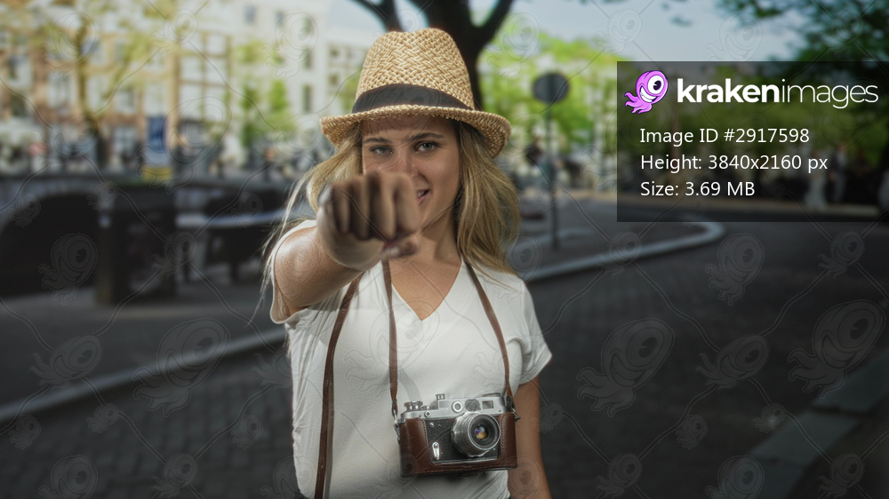 Woman wearing straw hat with vintage camera, fist forward toward lens on city street, smiling and playful gesture; adventure confidence.