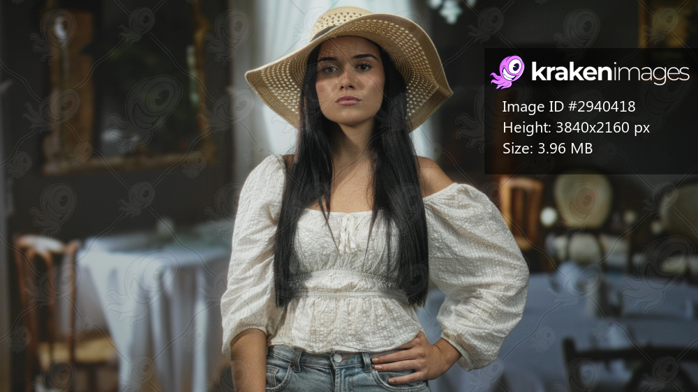 Woman wearing straw hat, white blouse and blue jeans, long black hair, hand on hip pose in a building with dining table and chairs; quiet confidence.