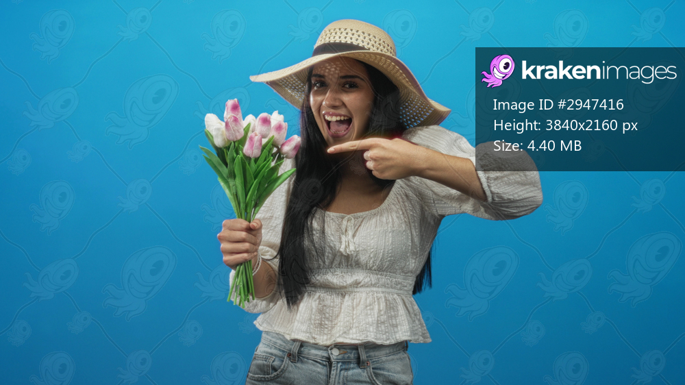 Woman wearing straw hat and white blouse holding pink tulips pointing finger at bouquet in studio; joyful spring celebration.