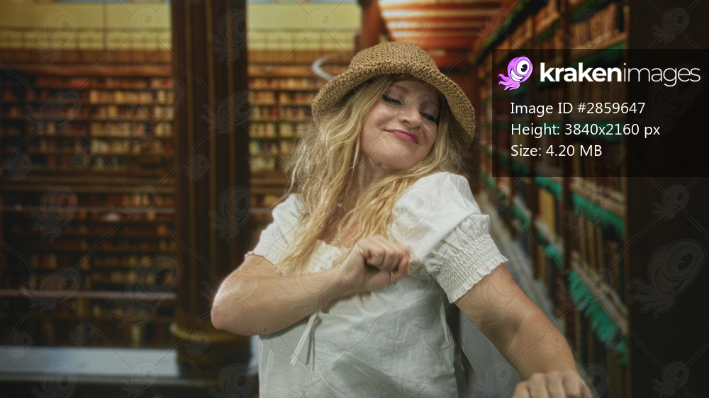 Woman wearing straw hat and white blouse pointing finger and dancing amid bookshelves in a historic library building; joyful playful carefree.