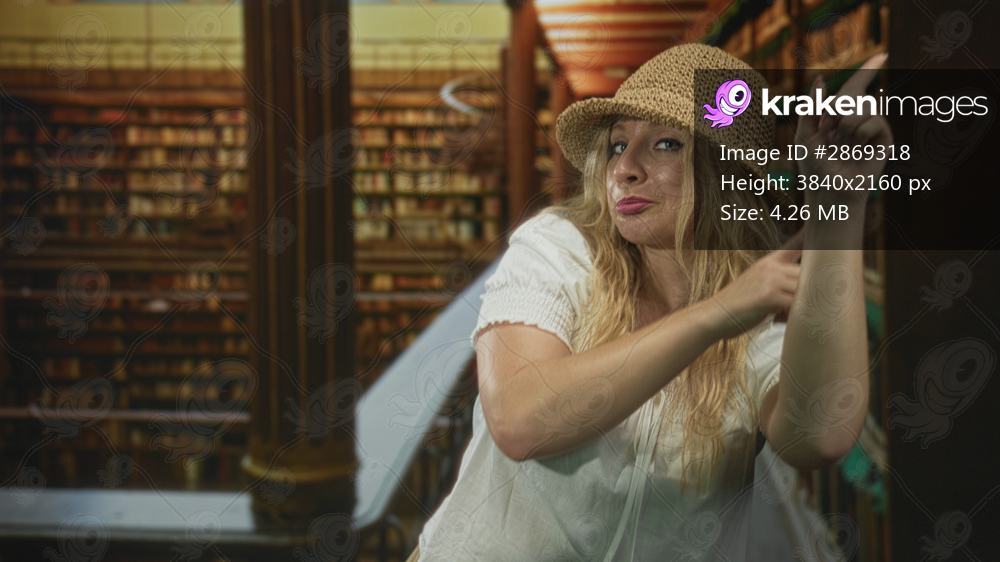 Woman wearing straw hat and white blouse pointing finger and dancing amid bookshelves in a historic library building; joyful playful carefree.