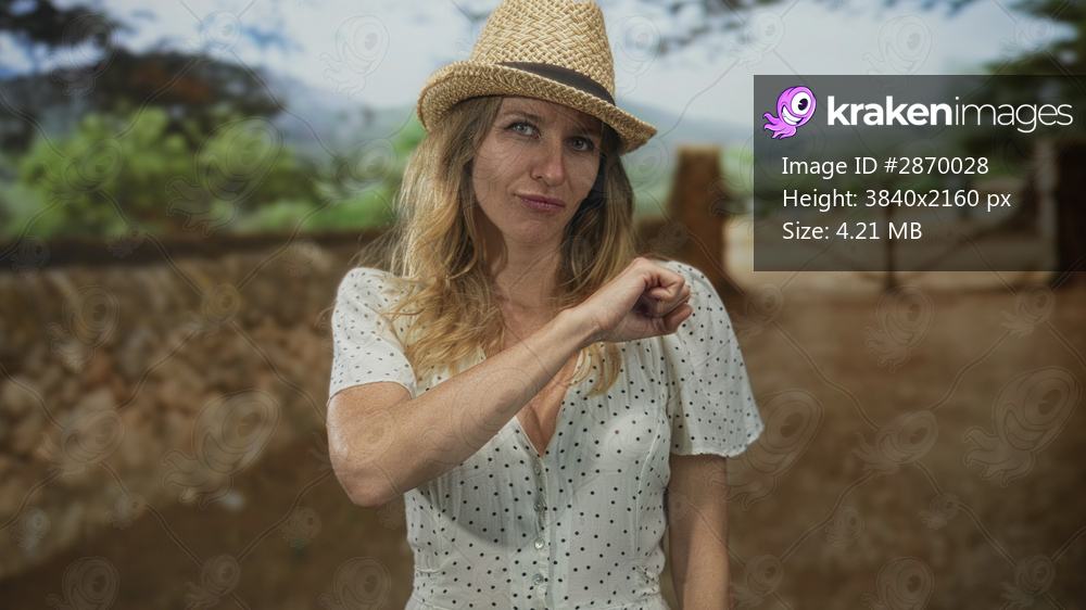 Woman wearing straw hat and white polka dot dress showing cleavage smiling warmly in forest setting; summer joy.