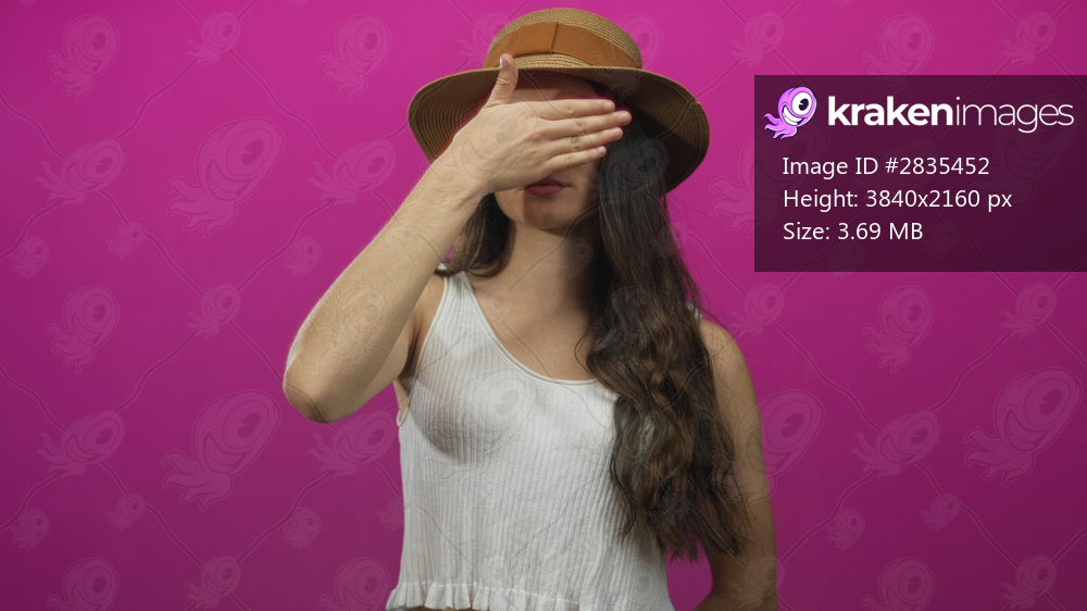 Woman wearing straw hat and white tank top covers eyes with hand against vivid pink backdrop in studio; secrecy.