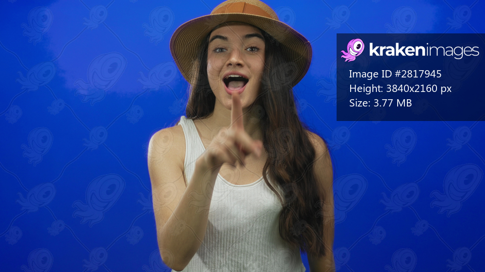 Woman wearing straw hat and white tank top smiling and making finger to lips gesture in studio; secrecy.