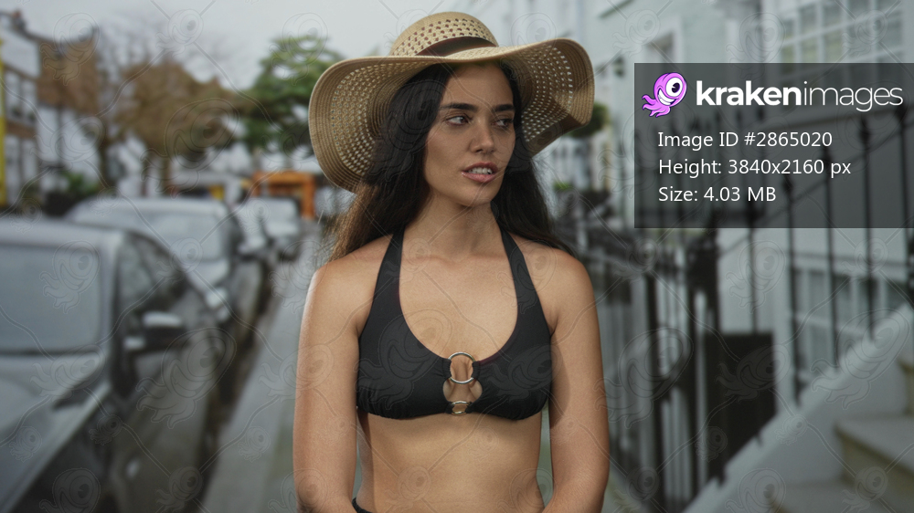 Woman wearing straw sun hat turns head to look sideways along parked cars on street; serenity calm leisure.