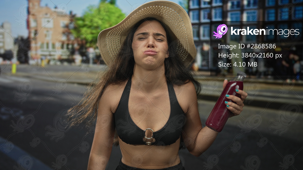 Woman wearing straw sunhat and black bikini top holds a juice bottle on a city street lined with brick buildings under sunlight; disgust.