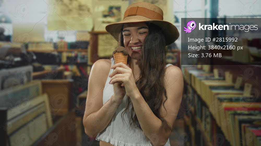 Woman wearing strawhat and holding ice cream cone with both hands and smiling in a historic library building; joy.