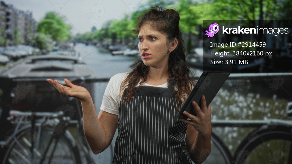 Woman wearing striped apron holds tablet and raises hand palm up on a street in amsterdam near canal and bicycles; logistics frustration.