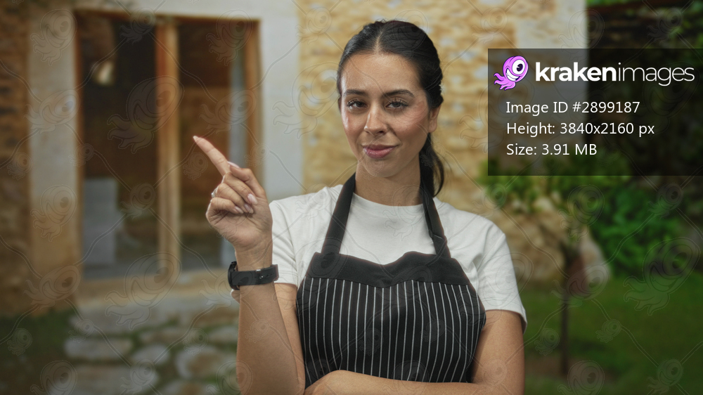 Woman wearing striped apron points finger at building entrance outside a house, showing a clear instruction gesture; confidence instruction.