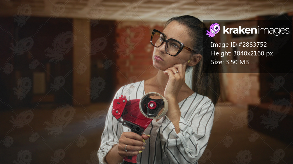 Woman wearing striped blouse and oversized glasses holding a tape dispenser and touching chin while pausing in an unfinished building; pensive planning. - Kraken Images
