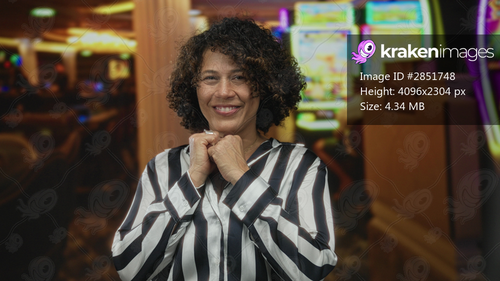 Woman wearing striped blouse puckers lips and points finger at slot machine in a building; gamble thrill excitement fortune.