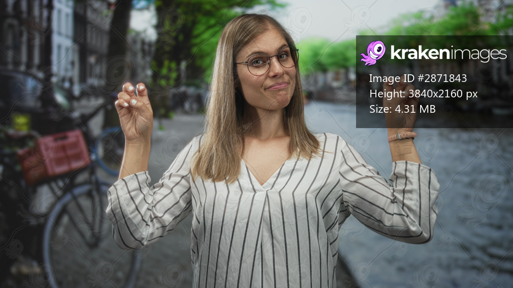 Woman wearing striped blouse shows finger quotes gesture on amsterdam street by canal alongside bicycles; playful sarcasm.