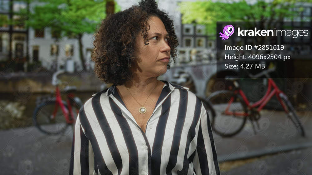Woman wearing striped blouse stands by canal on street in city with bicycle behind her; quiet contemplation.