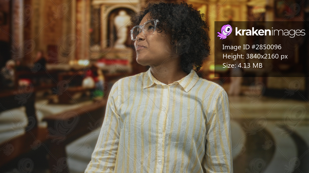 Woman wearing striped shirt and clear glasses points finger upward inside building interior; faith serenity.