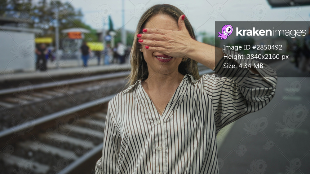 Woman wearing striped shirt covers eyes with hand on train station platform in daylight; playfulness.