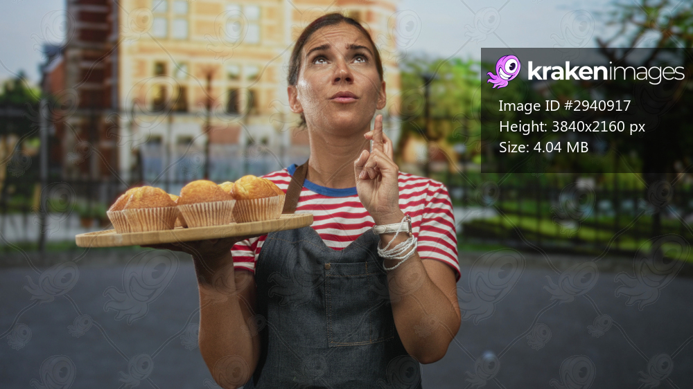 Woman wearing striped shirt and denim apron holding wooden tray of muffins with fingers crossed on street; hopeful luck wish.