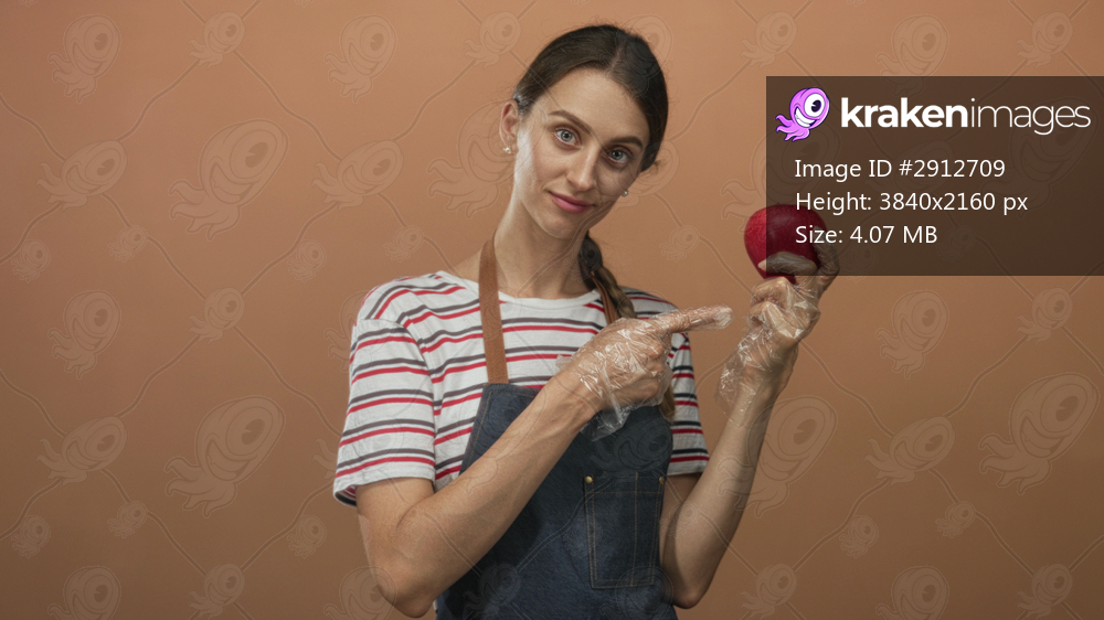 Woman wearing striped shirt and denim apron pointing with gloved hand to a red apple against a peach studio backdrop; cheerful healthy choice.