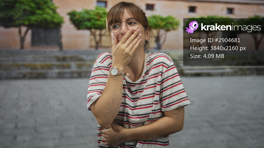 Woman wearing striped shirt and glasses covering mouth with hand and clutching stomach on a city street by stone steps and trees; laughter.