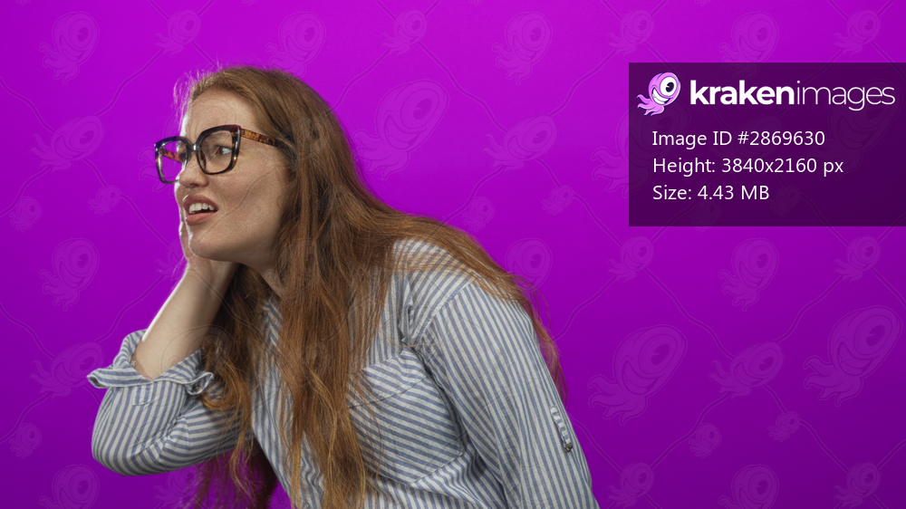 Woman wearing striped shirt and glasses cups ear to listen in studio with bright purple wall; curiosity.