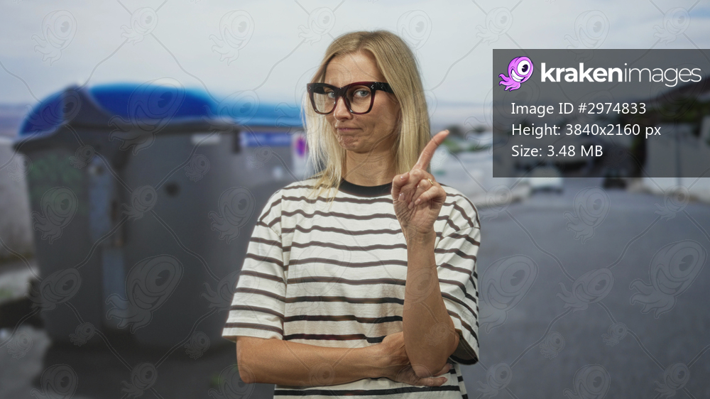 Woman wearing striped shirt and glasses points index finger up beside a large trash bin on a residential street; warning instruction.