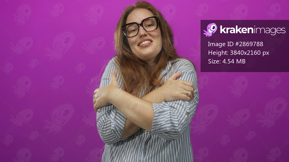 Woman wearing striped shirt and glasses smiles broadly and extends arms widely in a purple studio; affection.