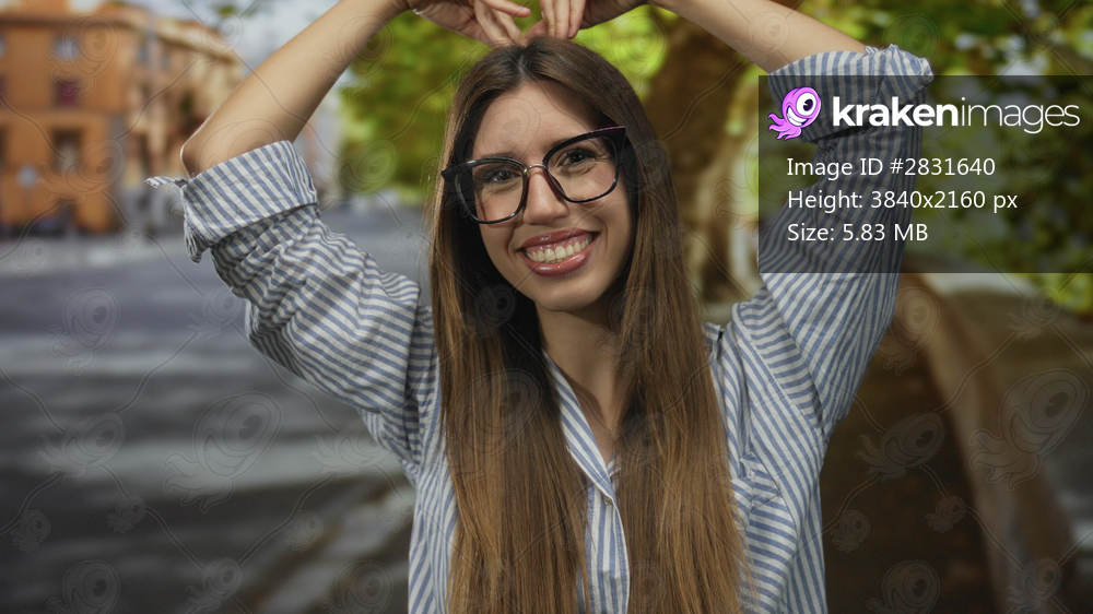 Woman wearing striped shirt and glasses smiles and makes heart gesture with hands on a street; affection.