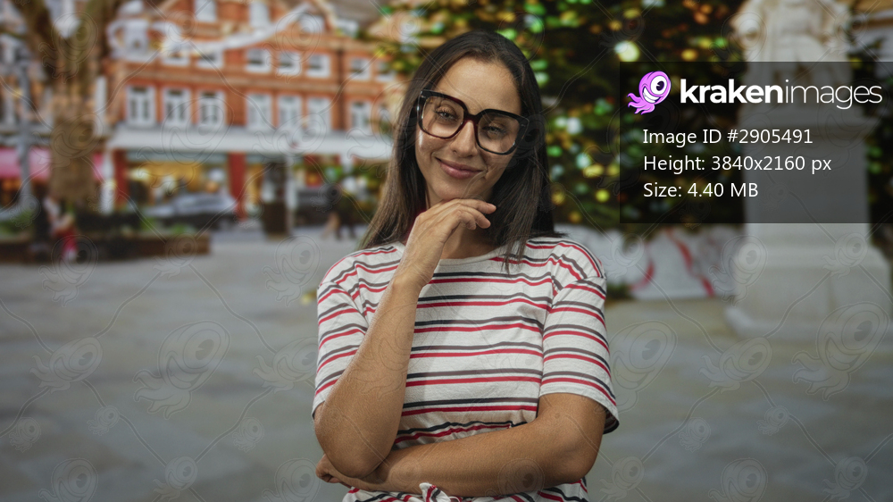Woman wearing striped shirt with hand on chin and crossed arms in street beside large decorated christmas tree and stone statue near shops; thoughtful. - Kraken Images