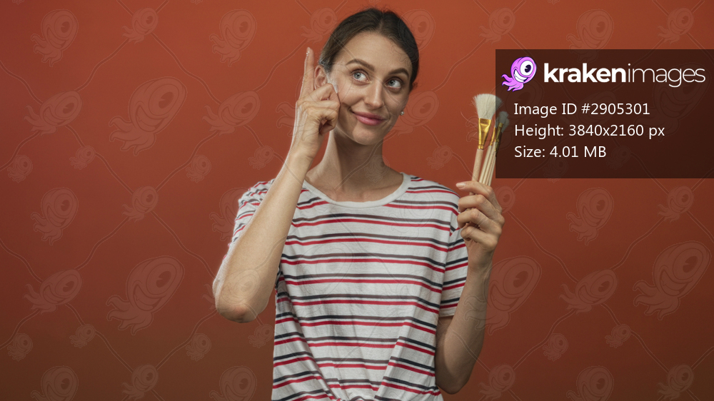 Woman wearing striped shirt holding brushes points finger to temple in orange studio; thoughtful creativity.