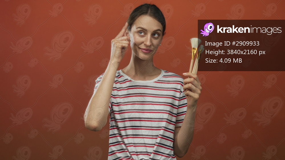 Woman wearing striped shirt holding brushes points finger to temple in orange studio; thoughtful creativity.