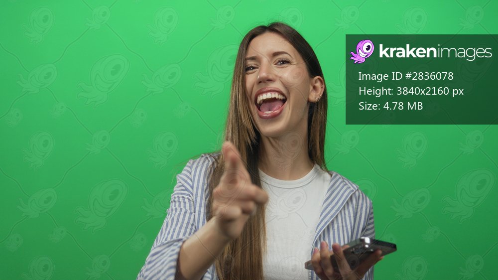 Woman wearing striped shirt holding smartphone and pointing finger in green studio; confidence engagement connection.