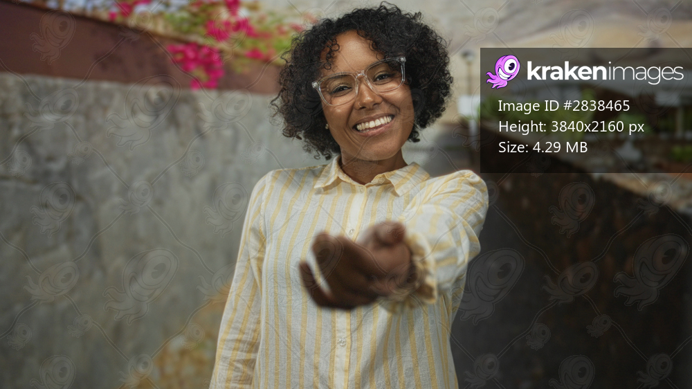 Woman wearing striped shirt offers handshake on urban street lined with stone walls and blooming bougainvillea; friendly welcome.