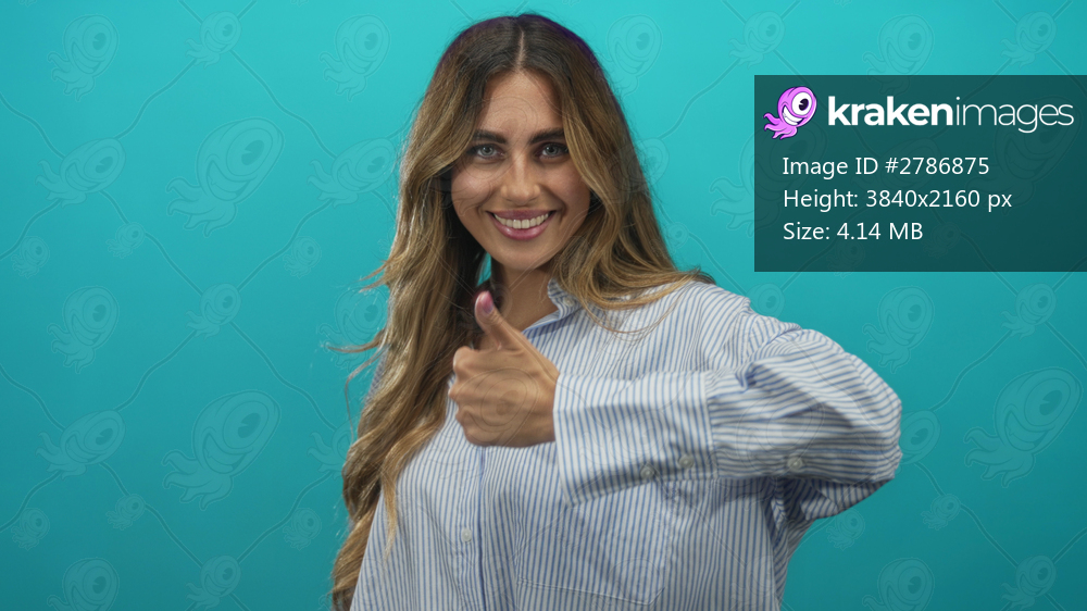 Woman wearing striped shirt showing bare hand giving thumbs up gesture in studio; approval optimism positivity.