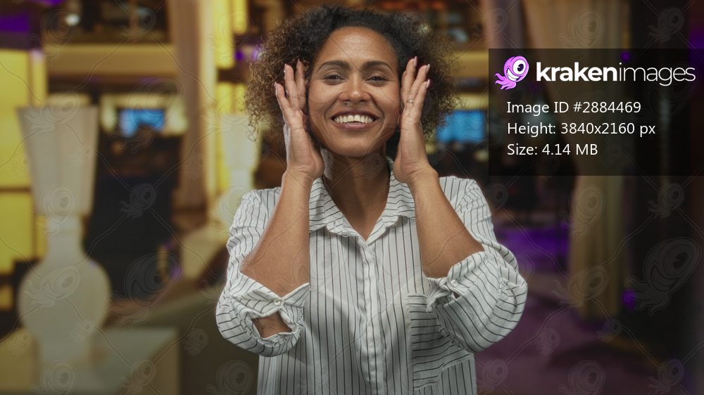 Woman wearing striped shirt smiling with hands framing face and ring on finger in building lobby; joy confidence warmth.