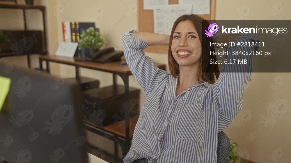 Woman wearing striped shirt stretches arms behind head while leaning in chair at office desk; relaxation.