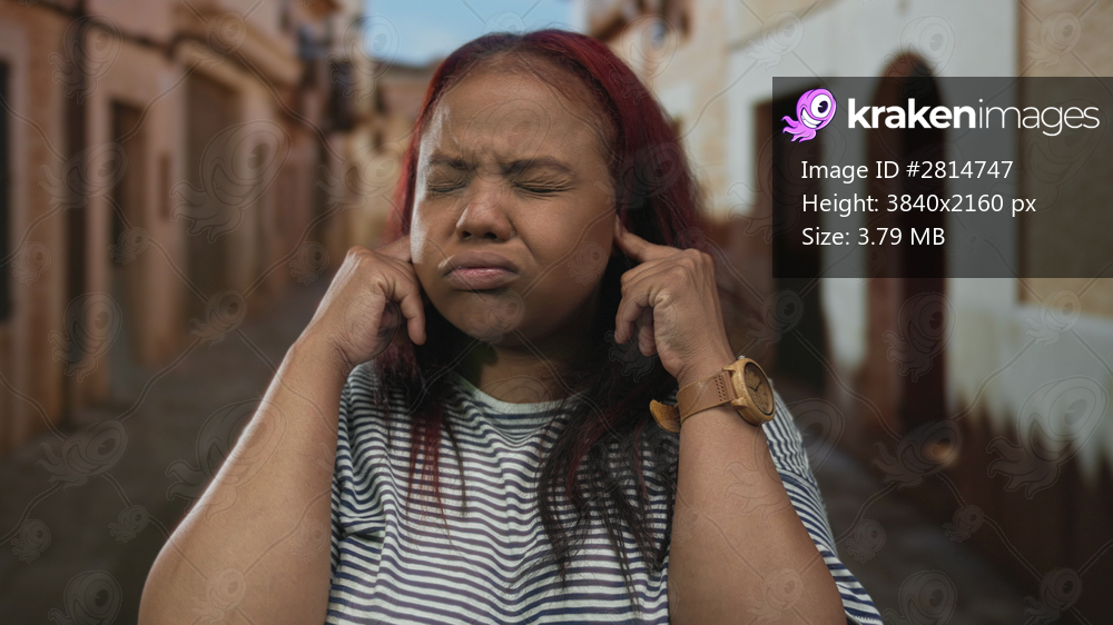 Woman wearing striped shirt and wooden watch presses ears with fingers on narrow cobblestone street in old town outdoors; pain.