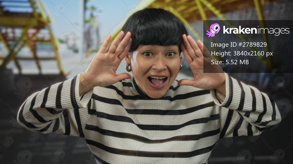 Woman wearing striped sweater poses playfully on city street with hands covering face, showcasing cheerful urban outdoor scene with vibrant background structure. - Kraken Images